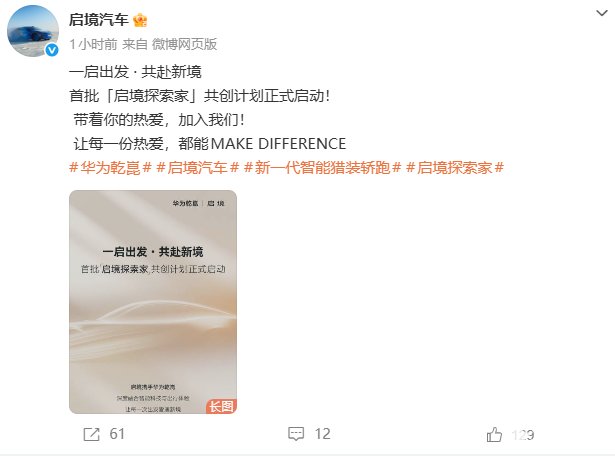 PChome 2月28日消息,华为乾崑与广汽集团联合打造的高端新能源品牌启境,正式宣布启动首批“启境探索家”用户共创计划,提供多项用户专属福利,面向公众开放招募。