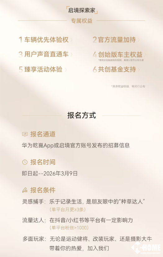 PChome获悉,本次共创招募时间为即日起至3月9日,用户可通过华为乾崑App、启境官方账号发布的招募信息报名参与。计划共提供车辆优先体验权、官方流量加持、用户声音直通车、创始版车主权益、臻享活动体验、共创基金支持六大权益,让用户在车型上市前可深度参与体验,并进行意见反馈。