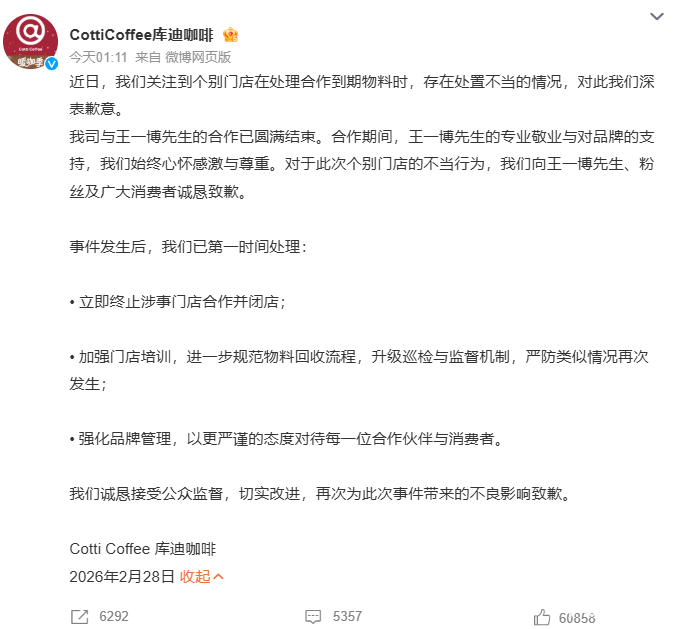 PChome 2月28日消息,针对网络热议“库迪销毁王一博物料”事件,库迪咖啡官方发布致歉声明,就个别门店在处理合作到期物料时的不当行为,向王一博本人、粉丝及广大消费者公开致歉,并公布整改与处罚措施。
