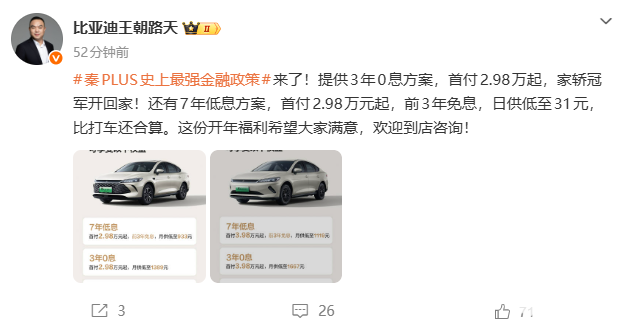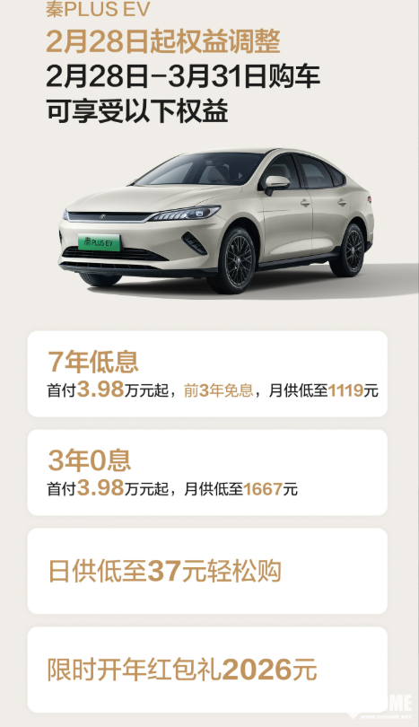 PChome 2月28日消息,比亚迪王朝网销售事业部总经理路天官宣,比亚迪秦PLUS正式推出史上最强金融政策,政策限时至3月31日,提供7年低息、3年0息及限时红包礼等权益,大幅降低购车门槛。