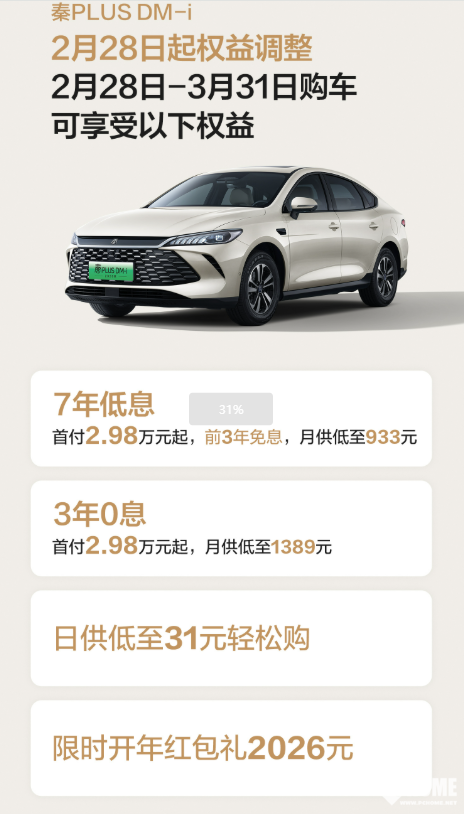 PChome获悉,据官方介绍,3年0息方案首付2.98万元起,月供低至1389元,全程免息无额外成本,适合计划节省利息、可短期结清的用户;7年低息方案同样首付2.98万元起,前3年免息,后续低息分期,月供低至933元,日均成本仅约31元,还款压力极小。同期购车还可享2026元开年红包礼,车型包括秦PLUS全系DM-i混动、EV纯电,兼顾省油、长续航与低用车成本,满足消费者的不同购车需求。