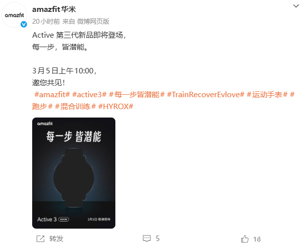 PChome 2月28日消息,华米(Amazfit)昨日官宣,全新智能手表Amazfit Active 3定于3月5日上午10:00正式发布,定位专业运动与全能健康监测,品牌宣传语为“每一步,皆潜能”。