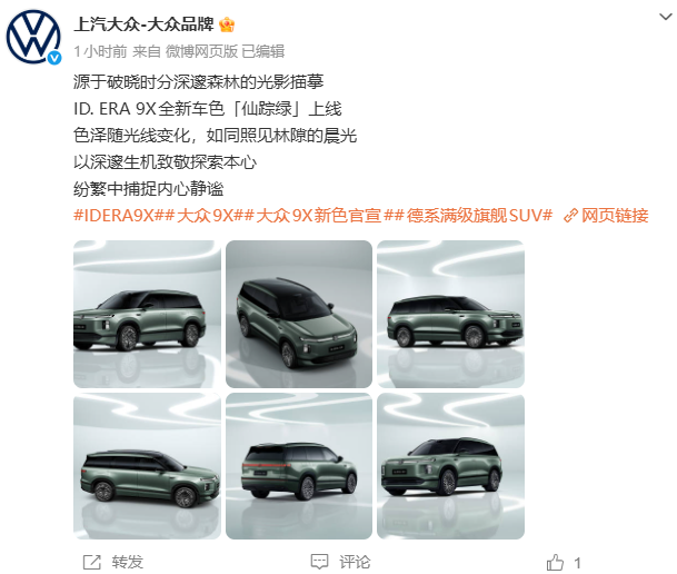 PChome 2月28日消息,上汽大众正式公布ID.ERA 9X仙踪绿全新车色官图,预计3月上市。