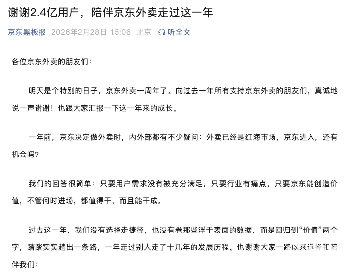 PChome 2月28日消息,京东外卖发布一周年公开信,系统披露过去一年的业务进展,并首次明确提出:希望到2026年将外卖市场份额提升至30%。