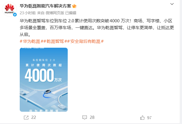 PChome 2月28日消息,华为乾崑智能汽车解决方案发布最新数据,旗下车位到车位2.0功能累计使用次数正式突破4000万次,同时实现了全国超100万个停车场全覆盖。