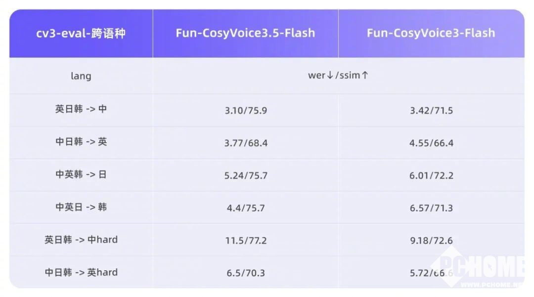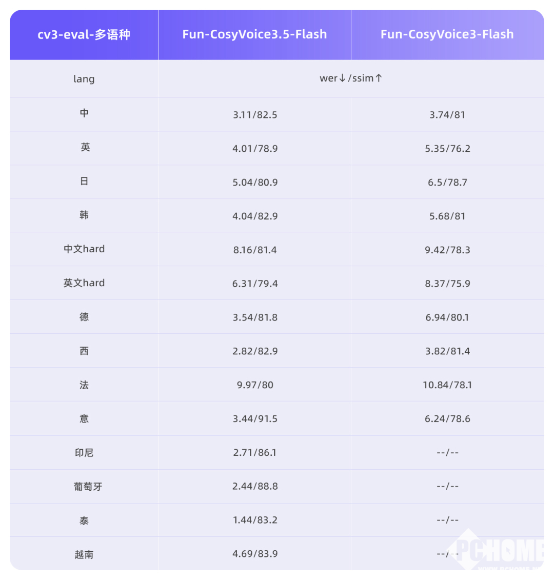 PChome获悉,Fun-CosyVoice3.5包含多语种复刻与精细化表达控制,用户可通过自然语言描述控制语音细节,模型实时调整合成效果;新增泰语、印尼语、葡萄牙语、越南语支持,覆盖13种语言,生僻字读错率从15.2%降至5.3%;Tokenizer帧率减半,首包延迟降低35%,实时交互响应更快;通过强化学习提升韵律自然度与表达层次感。