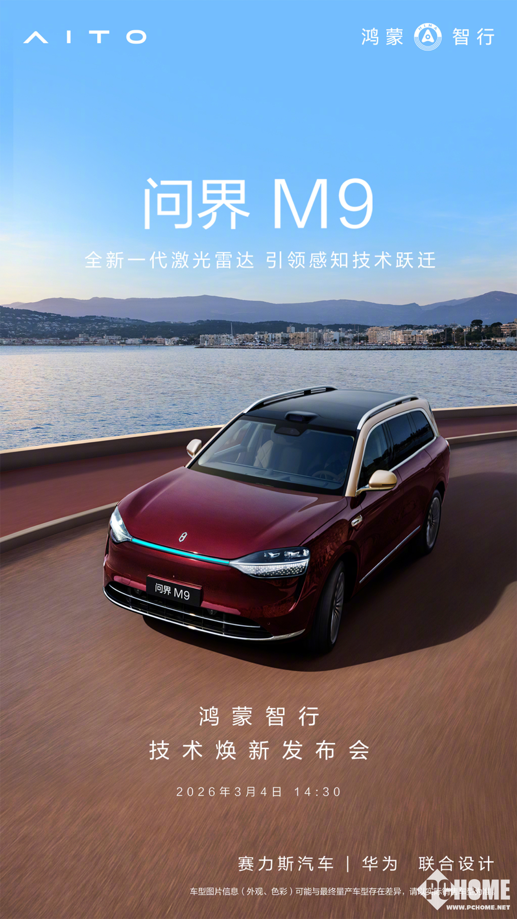 PChome 3月2日消息,鸿蒙智行官宣,问界M9首发搭载全球量产最高线束激光雷达,超高清、超精准、超远距。具体细节将于3月4日14:30举办的鸿蒙智行技术焕新发布会上公布。