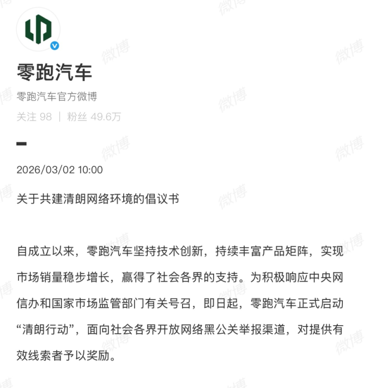 PChome 3月2日消息,零跑汽车于今日宣布启动“清朗行动”,面向全社会开放网络黑公关举报渠道,最高奖励500万元人民币。