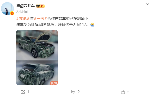 PChome 3月2日消息,据博主“德卤爱开车”透露,零跑汽车与中国一汽合作的首款车型已进入测试阶段,新车归属红旗品牌,定位新能源SUV,项目代号G117。