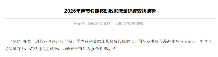 PChome 3月2日消息,工信部今日发布春节假期移动数据。数据显示,春节假期全国通信网络运行整体平稳,国内移动数据流量保持较快增长,AI应用全面融入节日生活,参与规模持续扩大,以智能化手段为新春注入强劲科技动能。
