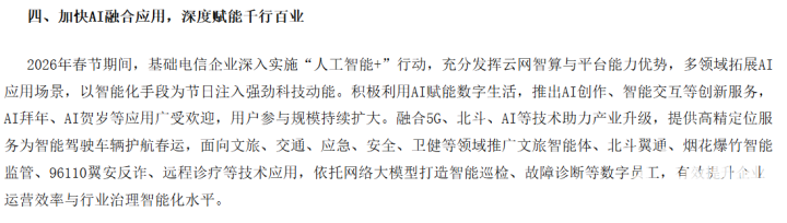 文章指出,春节期间,基础电信企业深入实施“人工智能+”行动,依托云网智算与平台能力优势,多领域拓展多元AI应用场景,面向大众推出AI创作、智能交互、内容生成等创新服务。AI拜年、AI贺岁、AI创作等功能广受用户欢迎,成为民众节日社交、年俗表达的新方式,用户使用频次与覆盖人群均得到大幅提升。