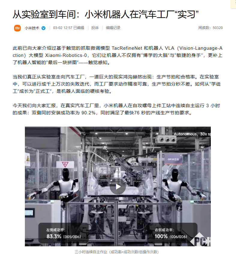 PChome 3月2日消息,小米技术官方发文称,小米自研人形机器人正式进入小米汽车工厂“实习”,在压铸车间自攻螺母上件工位完成真实产线装配任务,作业速度满足产线节拍要求,标志着小米机器人在智能制造领域的稳定应用落地。