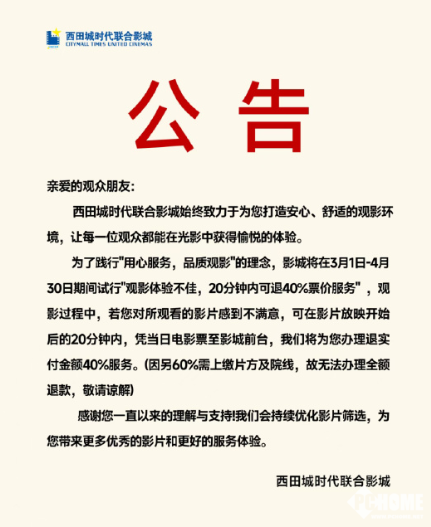 PChome 3月2日消息,杭州西田城时代联合影城推出了一项观影体验保障服务——“观影后悔权”,观众在影片开场20分钟内若觉得内容难看、体验不佳,可凭票现场退还实际支付金额的40%,引发网友热议。