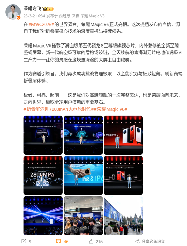 PChome 3月2日消息,在MWC2026巴塞罗那世界移动通信大会上,荣耀正式发布新一代横向折叠旗舰Magic V6。荣耀产品线总裁方飞表示,作为赛道引领者,荣耀再次成功挑战物理极限,以全能实力与极致轻薄,刷新高端折叠屏体验。