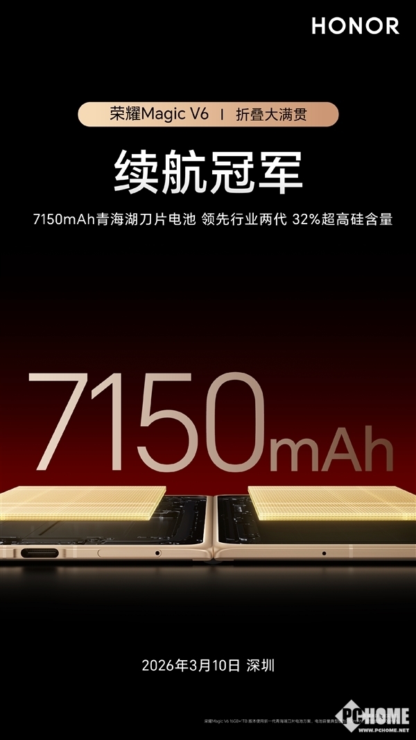 PChome获悉,荣耀Magic V6凭借8.75mm厚度,再度刷新折叠屏轻薄纪录。该机搭载新一代航空级盾构钢铰链,兼顾轻薄与耐用;首发全新一代7150mAh青海湖刀片电池,采用第五代硅碳负极材料,能量密度突破900Wh/L,为折叠屏带来全天续航保障。