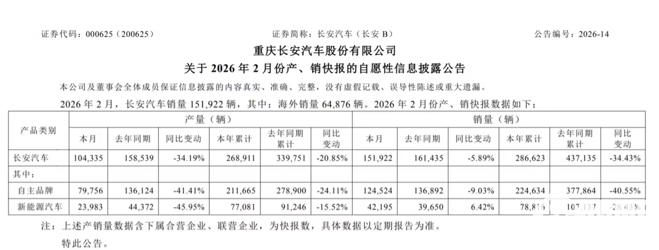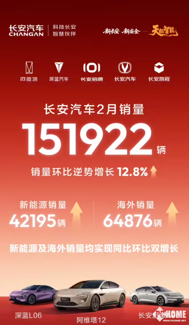 PChome 3月2日消息,长安汽车发布2026年2月产销快报,当月公司汽车销量达151922辆,同比下降5.89%,环比增长12.8%,呈现“同比微降、环比回暖”的态势,逐步摆脱1月淡季影响。