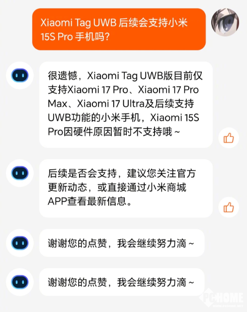 PChome 3月3日消息,小米客服确认因硬件限制,Xiaomi Tag UWB版暂无法适配小米15S Pro手机。