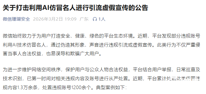 PChome 3月3日消息,“微信珊瑚安全”公众号于昨日发布了关于打击利用AI仿冒名人进行引流虚假宣传的公告,严厉整治利用AI技术伪造公众人物形象、声音,用于违规引流、虚假宣传、误导用户等乱象,切实维护网络生态与用户、名人合法权益。