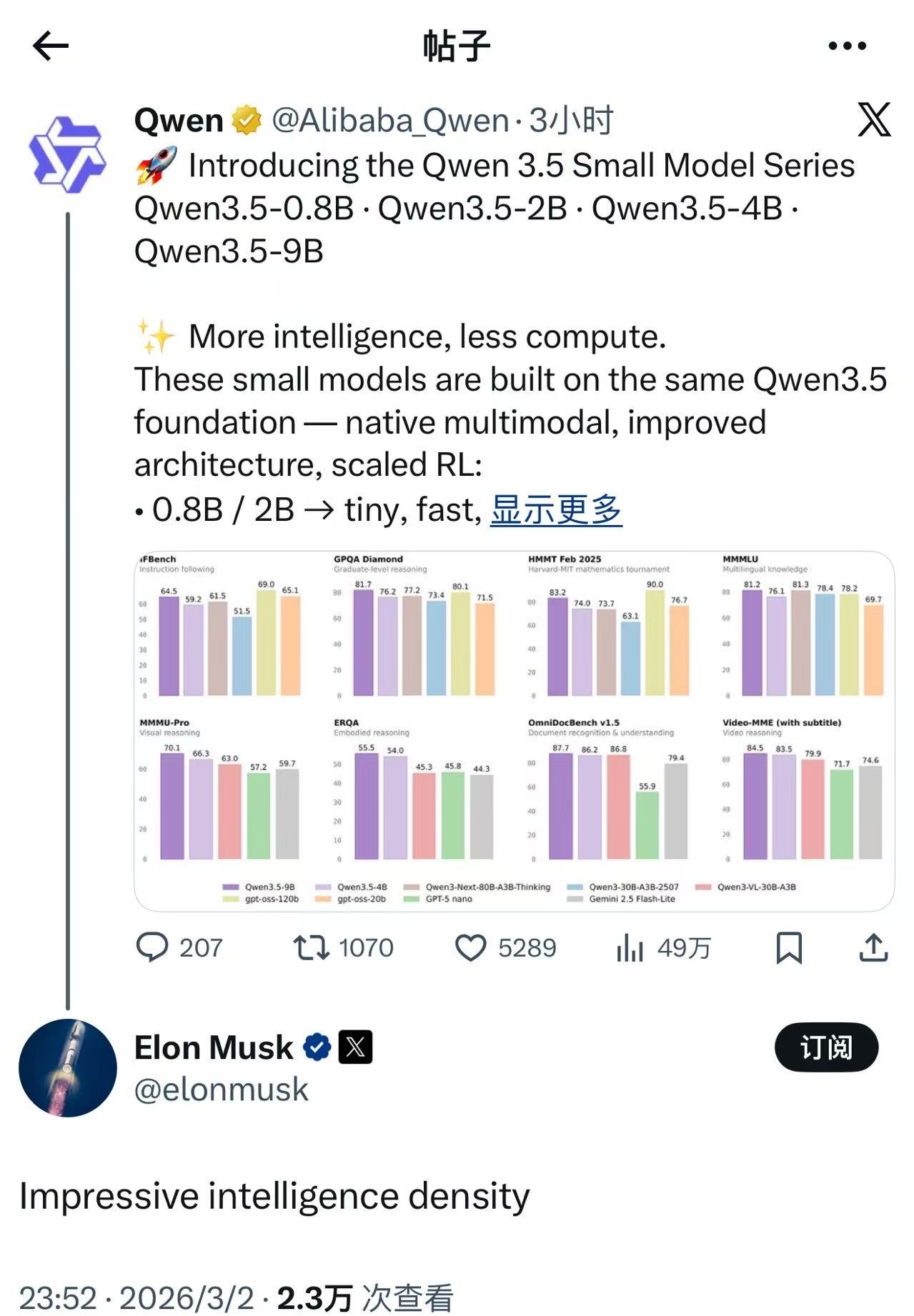 PChome 3月3日消息,特斯拉创始人兼首席执行官埃隆·马斯克在社交媒体上,点评阿里巴巴的Qwen模型,认为其拥有“令人印象深刻的智能水平。”