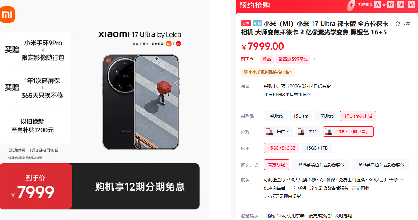 目前,小米 17 Ultra 徕卡版全新的黑银配色现已在京东开售,提供16GB+512GB(7999元)、16GB+1TB(8999元) 双存储版本,与现有徕卡版保持同价。徕卡官方渠道的具体上市时间有待官方后续公布。