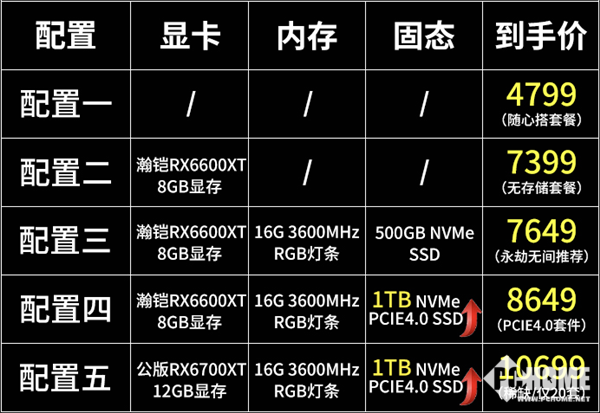 微星宙斯盾Z5还提供了多款升级方案供消费者选择,7649元即可凑齐整套主机,搭配近期刚刚发布不久的瀚铠RX6600XT 8G,玩转永劫无间等近期热门新游也是毫无压力。在目前RX6600XT单卡都卖到四千多的当下显得相当划算。