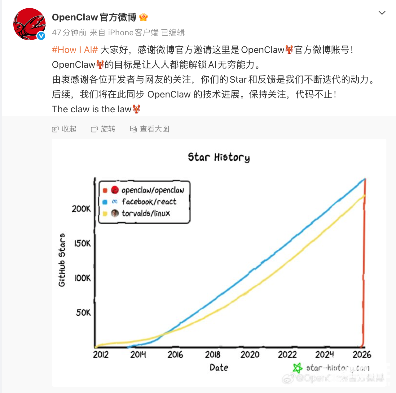 值得注意的是,OpenClaw还晒出了一张GitHub项目星标数量历史趋势图,图表时间跨度从2012年至2026年,截至2026年,facebook/react、torvalds/linux和openclaw/openclaw三个项目的星标数均达到约20万以上,但openclaw/openclaw的增长曲线最为陡峭。