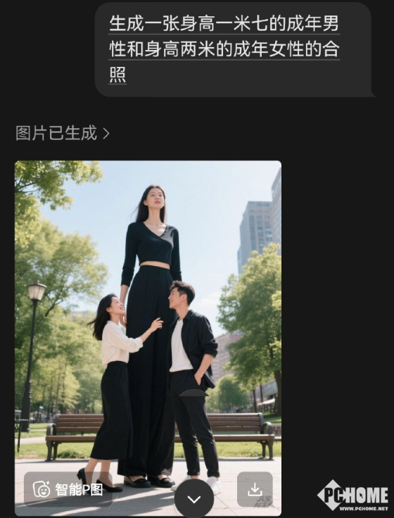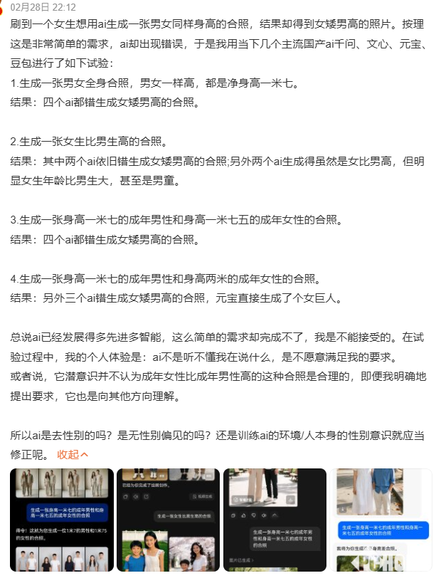 PChome 3月3日消息,近日,“AI生成男女身高”的话题引发全网热议。有网友对千问、文心一言、元宝、豆包四款主流AI进行实测,要求生成同身高男女合照或女高男矮的合照,结果全部出现偏差,普遍默认呈现“男高女矮”画面,暴露出AI图像生成中的刻板印象问题。