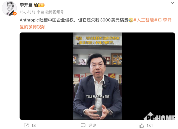 针对这一指控,李开复在社交媒体平台发布视频称:模型蒸馏本身并未违反行业规则,Anthropic的抱怨未免有些小题大做。他同时提及,Anthropic此前曾因盗版数百万本图书被起诉,最终支付15亿美元和解金,自己作为受害作家之一,至今仍在等待3000美元(约合人民币2.08万元)的赔偿款。