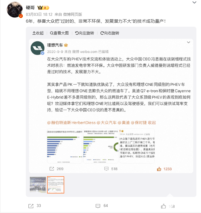 PChome 3月4日消息,昨日,理想汽车高管“硬哥”在微博上发文,祝贺大众量产其曾评价为“过时、不环保、发展潜力不大”的增程技术,引发行业热议。