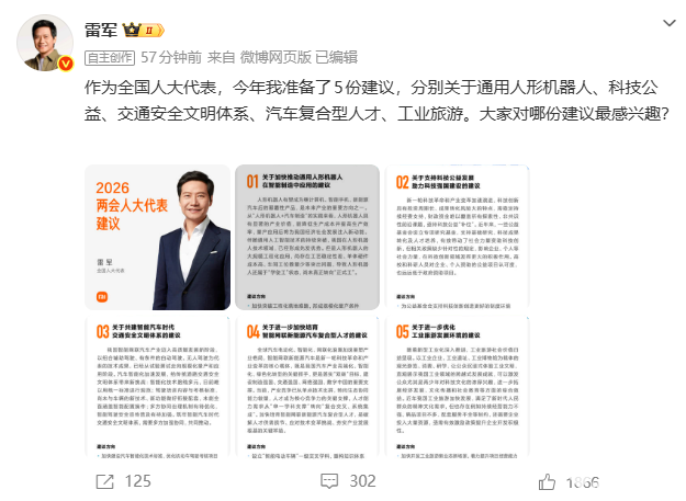 PChome 3月4日消息,小米集团创始人、董事长兼CEO雷军今日在微博公布了多项2026两会建议,重点围绕通用人形机器人产业化应用与智能网联汽车产业发展,助力新型工业化与产业高质量、可持续发展。