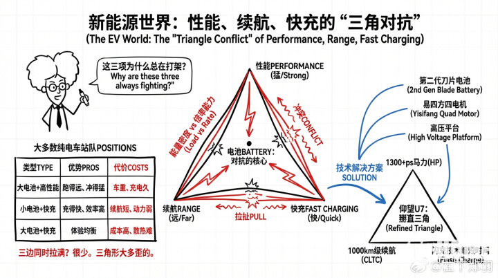 PChome获悉,郑羽指出,其本质是电池的物理约束:电池容量越大、能量密度越高,充放电时所需的大电流会带来热管理压力与安全风险,导致高性能输出和快速充电难以与长续航共存。而传统设计中,提升其中一项往往需牺牲另一项,行业普遍只能侧重单一方向。据郑羽表示,新款仰望U7首搭第二代刀片,高压平台协同和整车热管理升级,在系统层面做突破,实现四电机高性能且超1000公里长续航唯有U7,实现了让三角更接近“等边”,并且配上了信息图。