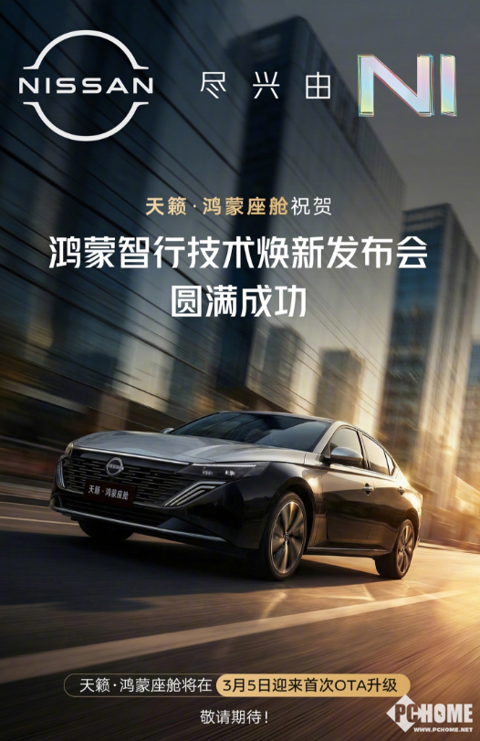 PChome 3月4日消息,东风日产天籁·鸿蒙座舱的首次OTA升级定于3月5日正式推送,此次更新将引入华为MoLA大模型技术,优化AI语音交互、导航精准度和3D智控桌面功能。
