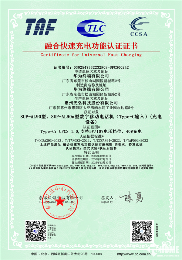 PChome 3月4日消息,FCA终端快充行业协会宣布,华为Mate 70 Air成功通过UFCS融合快充认证,获得官方认证证书与UFCS商标授权,支持66W华为超级快充,同时兼容通用融合快充协议。