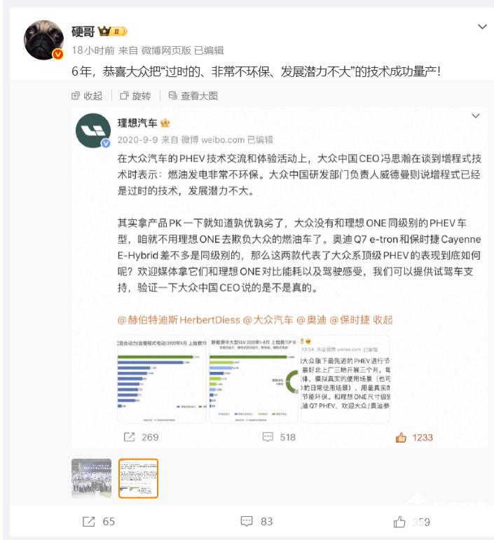 PChome 3月4日消息,理想汽车公关总监“硬哥”以一句“6年,恭喜大众把‘过时的、非常不环保、发展潜力不大’的技术成功量产!”的讽刺性祝贺,直指大众中国高管2020年对增程技术的贬低言论。