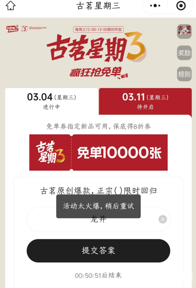 PChome获悉,古茗每周三12:00-13:00在小程序开放“免单星期三”活动,限量发放1万张免单券,用户需输入指定口令答案参与抢券,若未抢到免单券,用户可获得保底8折优惠券,活动期间每个账号限抢一次,免单券仅适用于指定新品。大量用户反映小程序在活动开始后持续显示“活动火爆”或卡顿,部分质疑“是否放券量不足”或存在技术故障。同时,上海、南京等城市用户多次询问门店覆盖情况,小县城用户则直接表示“本地无门店”,凸显活动区域局限性。