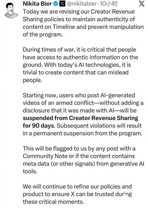 PChome 3月4日消息,马斯克旗下的X平台宣布,发布未标注的AI生成武装冲突视频创作者,将被暂停参与创作者收益分成计划90天,若再次违规,将被永久取消资格。