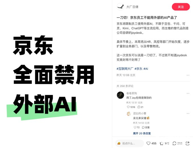 京东方面表示,外部AI工具存在数据上传第三方服务器、隐私合规不可控等风险,禁用是企业数字化与数据安全治理的常规操作,同时通过此举强化对AI技术的自主掌控能力。