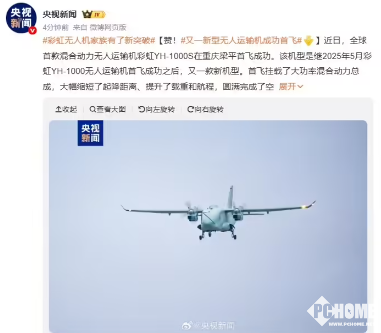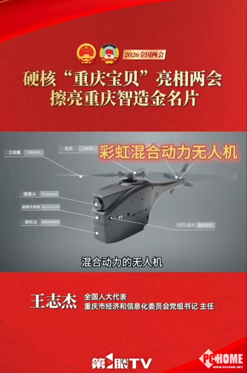 PChome 3月5日消息,由中国航天与赛力斯联合开发的全球首款混合动力无人机——彩虹YH-1000S正式于2026全国两会中公开亮相。