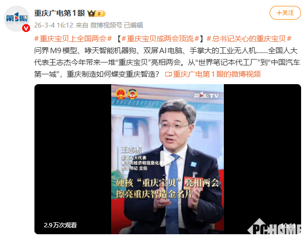 此外,在本次大会中全国人大代表、重庆市经济和信息化委员会党组书记、主任王志杰还带来了其他“重庆宝贝”——问界M9模型、哮天智能机器狗、双屏AI电脑、手掌大的工业无人机等,向全国展现重庆力量。