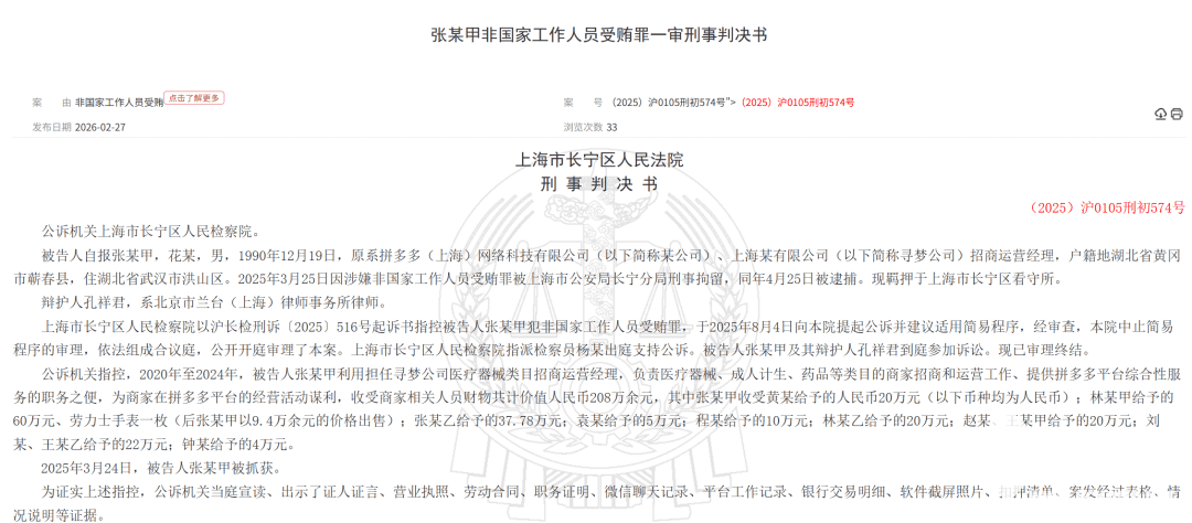 近日,上海市长宁区人民法院一审判决书公开,原拼多多医疗器械类目招商运营经理张某甲因非国家工作人员受贿罪,被判处有期徒刑三年五个月,并处罚金20万元。该案涉案金额超208万元,暴露出电商平台招商运营环节的廉政风险。