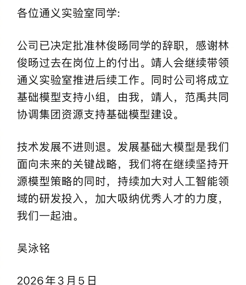 据PChome了解,事发源于3月3日下午内部会议后双方产生分歧,林俊旸当场提出辞职。林俊旸为阿里巴巴最年轻的P10级技术负责人,主导Qwen系列大模型的研发与开源,其离职或与通义实验室计划将Qwen团队从“垂直整合”拆分为预训练、后训练等水平分工小组有关,此举缩小了林俊旸的管理范围,与其主张的技术一体化理念相悖。阿里CEO吴泳铭于3月5日发布内部邮件,正式批准林俊旸辞职,同时宣布成立 “基础模型支持小组” ,由吴泳铭、阿里云CTO周靖人、范禹共同协调集团资源支持大模型研发。
