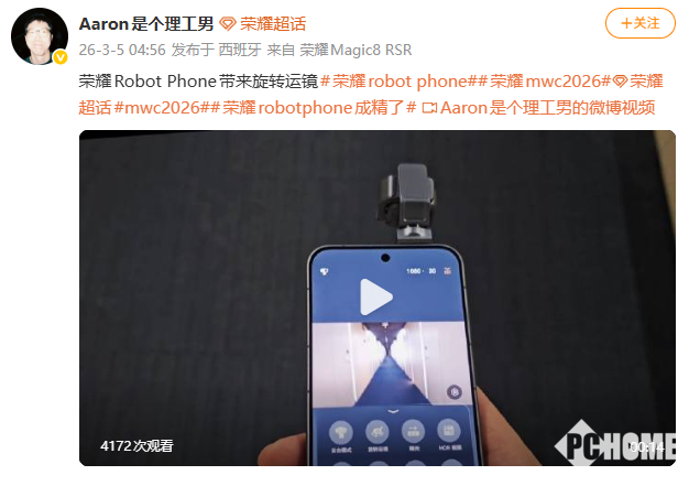 PChome 3月5日消息,近日,荣耀影像专家“Aaron是个理工男”发布荣耀Robot Phone机器人手机旋转运镜功能实拍演示视频,全方位展现这款行业首创机器人手机的电动翻转镜头与智能运镜实力。