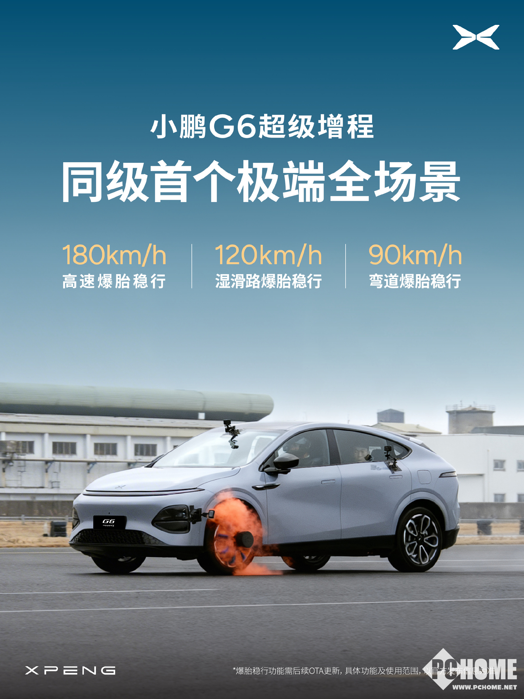 PChome 3月5日消息,小鹏汽车官微官宣,小鹏G6超级增程完成同级首个极端全场景爆胎测试,在高速、湿滑、弯道等极限工况下,依然稳得住、刹得停。