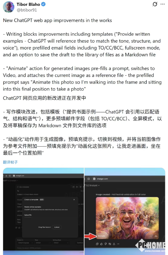 PChome获悉,用户上传历史邮件、文章等文本后,ChatGPT自动分析其语言结构、用词习惯、情感表达等细节,生成高度个性化的内容模板。首次使用即可生成贴近用户风格的文本,无需反复调整提示词。新增邮件专属字段,支持全屏写作模式,草稿可一键保存为Markdown格式,大幅提升职场场景效率。