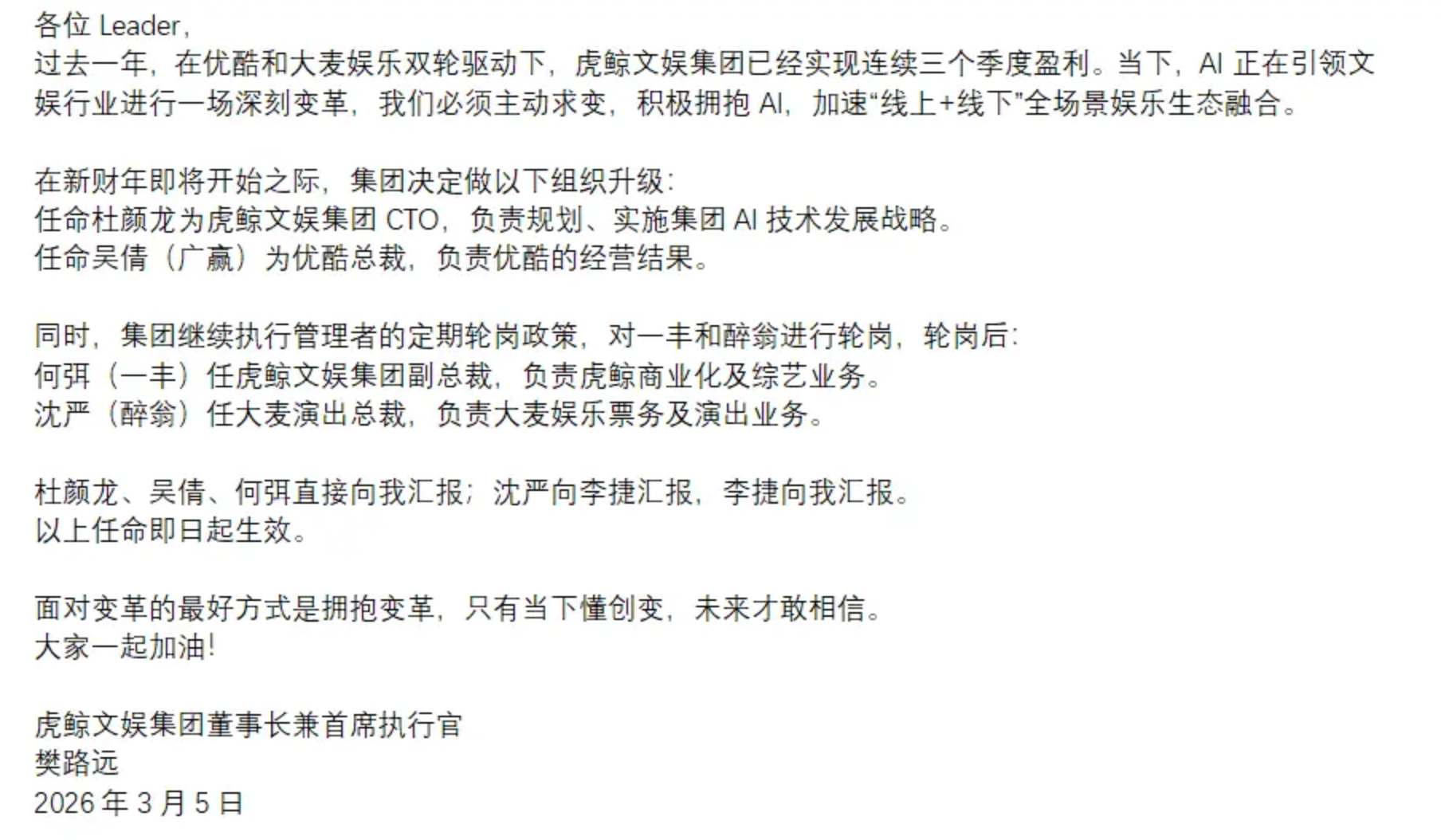 PChome 3月5日消息,虎鲸文娱集团董事长兼首席执行官樊路远发出内部邮件,宣布在新财年即将开始之际进行组织升级,积极拥抱AI,加速“线上+线下”全场景娱乐生态融合。
