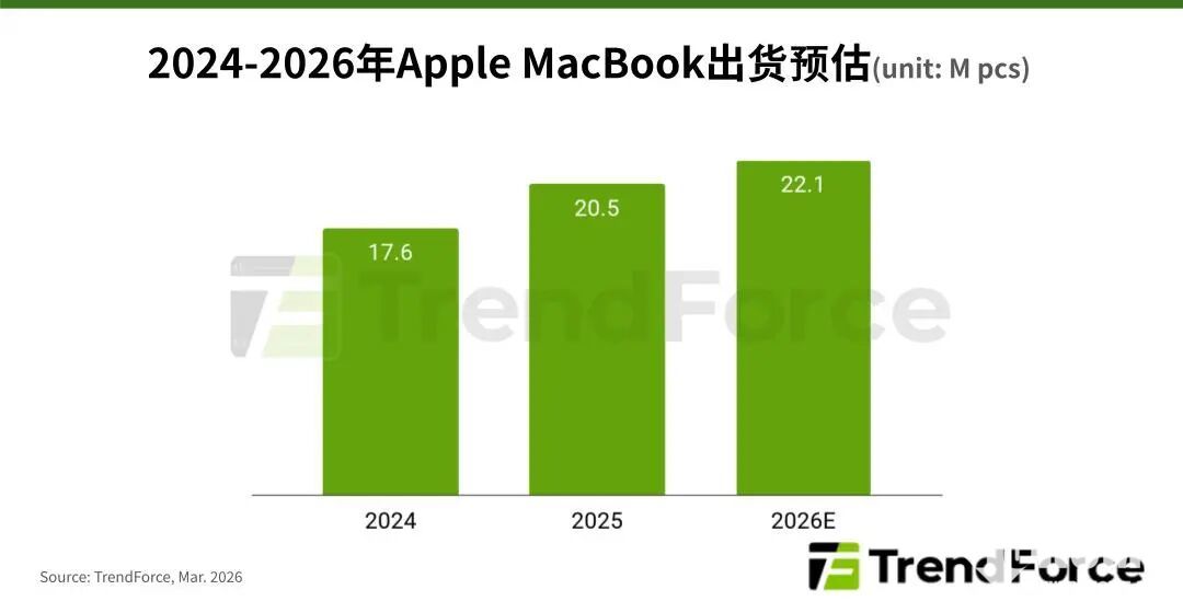 PChome 3月5日消息,TrendForce集邦咨询最新研报分析,苹果公司近期推出的入门级笔记本电脑MacBook Neo,起售价4599元,有望在2026年实现400万至500万台的出货量。