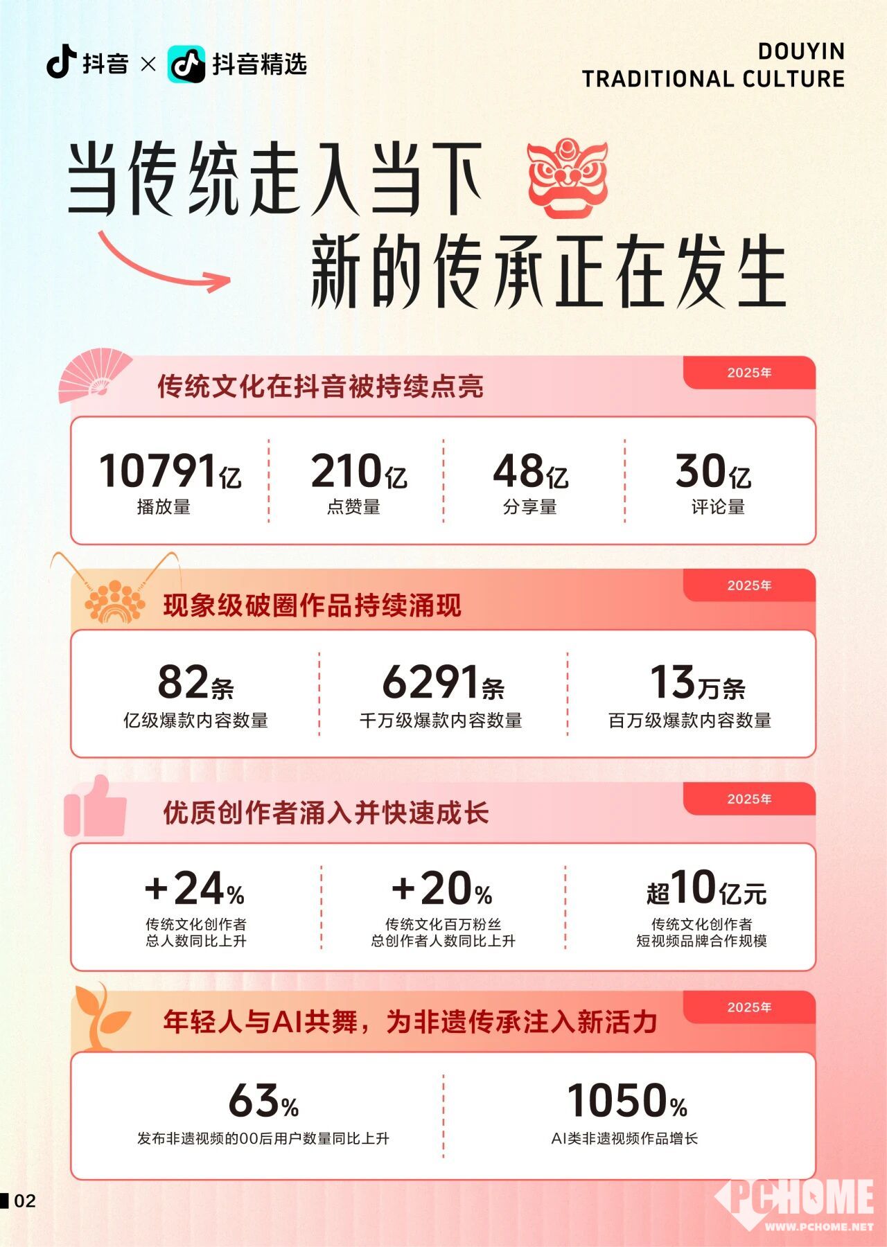 据PChome了解,报告显示,2025年抖音平台上传统文化相关内容总播放量超过1万亿次,累计获得超200亿次点赞、超48亿人次分享,平均每天都有数以亿计的网友在抖音与传统文化相遇,古韵国风已然成为名副其实的“流量密码”。值得注意的是,2025年,平台上AI类非遗视频作品增长超10倍。AI技术的深度应用,正在助力传统文化实现“破圈”传播,抖音上的创作者们利用AI解析应县木塔的结构、复原世界遗产西夏王陵的建造过程,科普干知纪年法、玲珑瓷工艺,通过AI技术让抽象的历史知识与复杂技艺变得更直观。