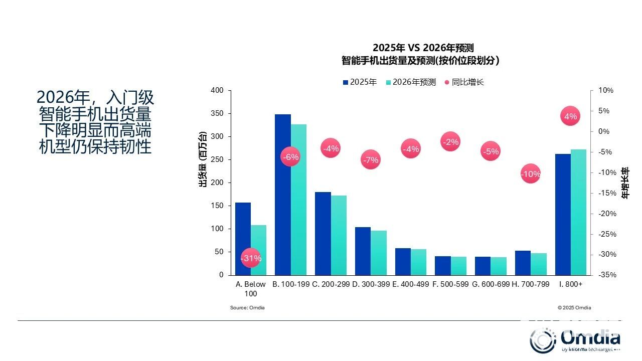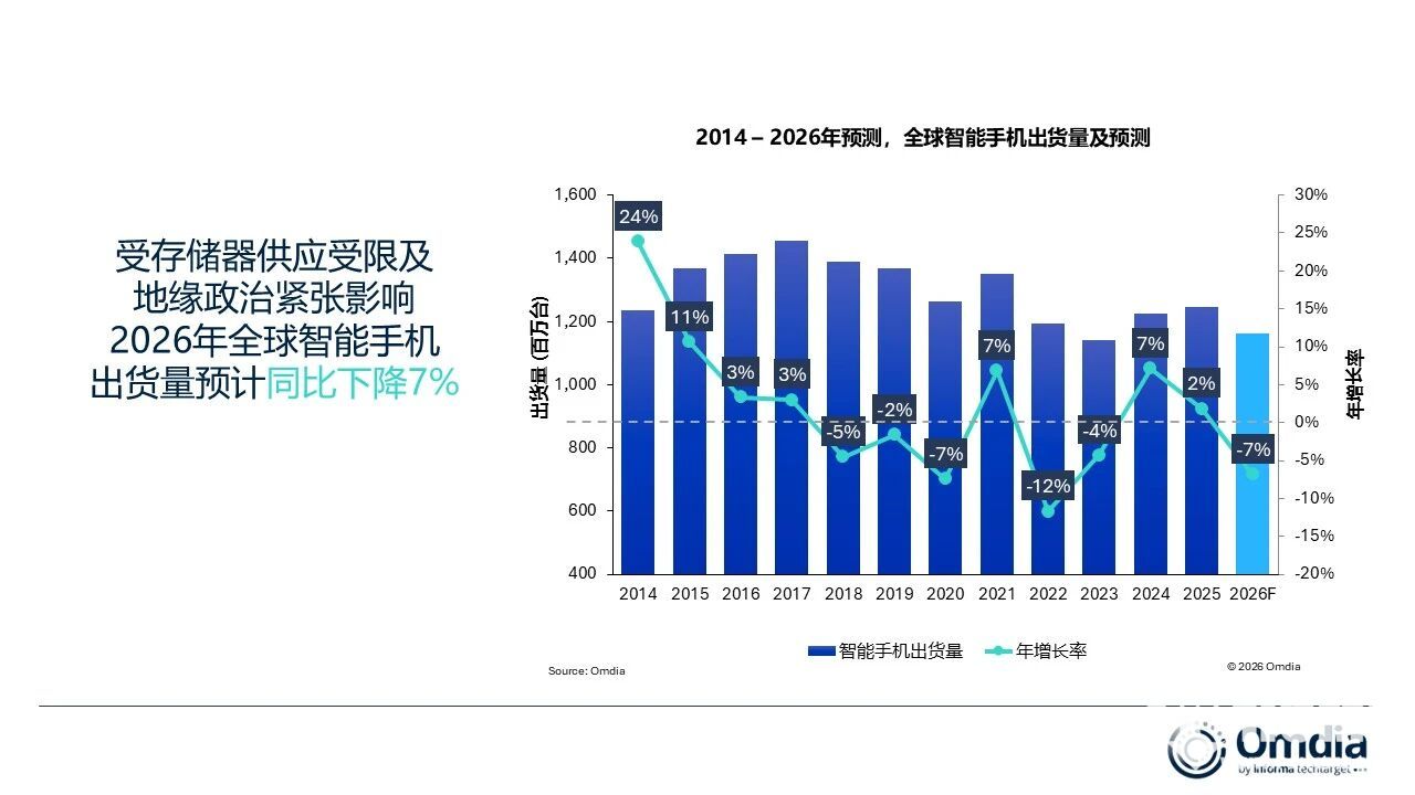 Omdia同时警告,若服务器等领域的需求继续锁存存储器产能,导致价格在下半年仍无明显回落,叠加地缘政治紧张可能引发的宏观经济波动,全球智能手机市场面临的下行风险将加剧,最坏情况下年度出货量跌幅或超过15%。
