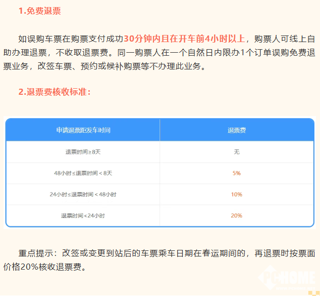 对于退票与改签问题,如误购车票在购票支付成功30分钟内且在开车前4小时以上,购票人可线上自助免费办理退票手续。同一购票人在一个自然日内限办1个订单误购免费退票业务,改签车票、预约或候补购票等不办理此业务 。若申请退票距离发车时间超八天以上可免费办理退票手续;若在48小时以内,需额外支付5%手续费;24小时以内为10%;不足24小时需支付20%。
