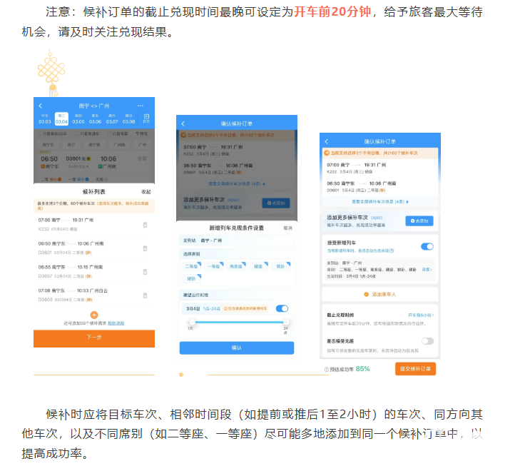 指南明确,候补购票是官方最推荐的方式。无票时应第一时间提交候补,建议多选日期、车次与席别,最多可提交6个候补订单、覆盖60个“日期+车次”的购票组合,同时勾选“接受新增列车”后,新增列车的票额会优先投放给已提交候补订单的旅客,可进一步提高候补成功率。